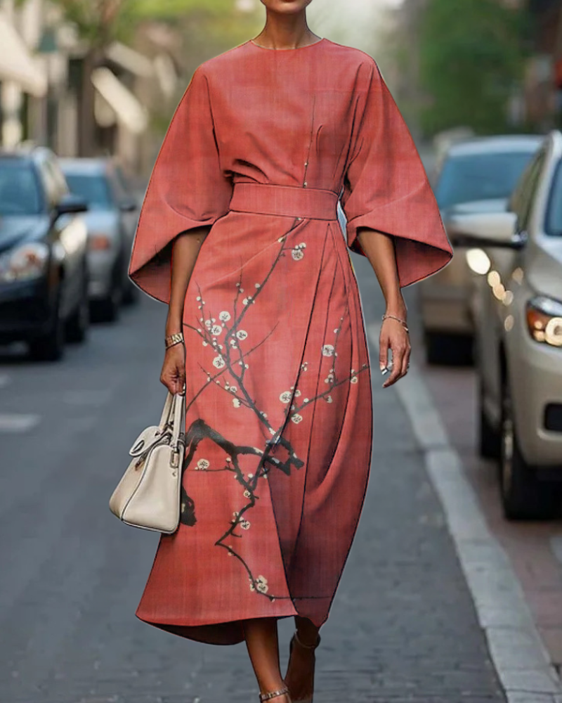 Maxi Elbise - Kırmızı Yaprak Desenli