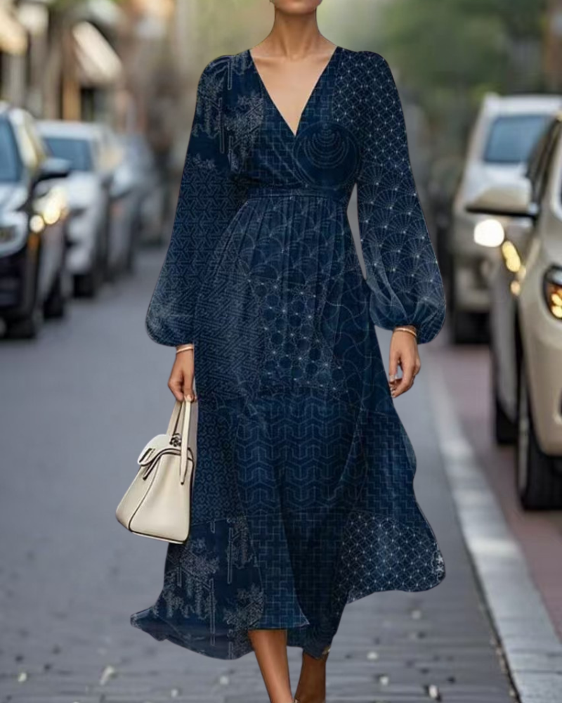 Emily™ | Kadınlar için V-Yaka Kısa Kol Düz Kesim Desenli Elbise